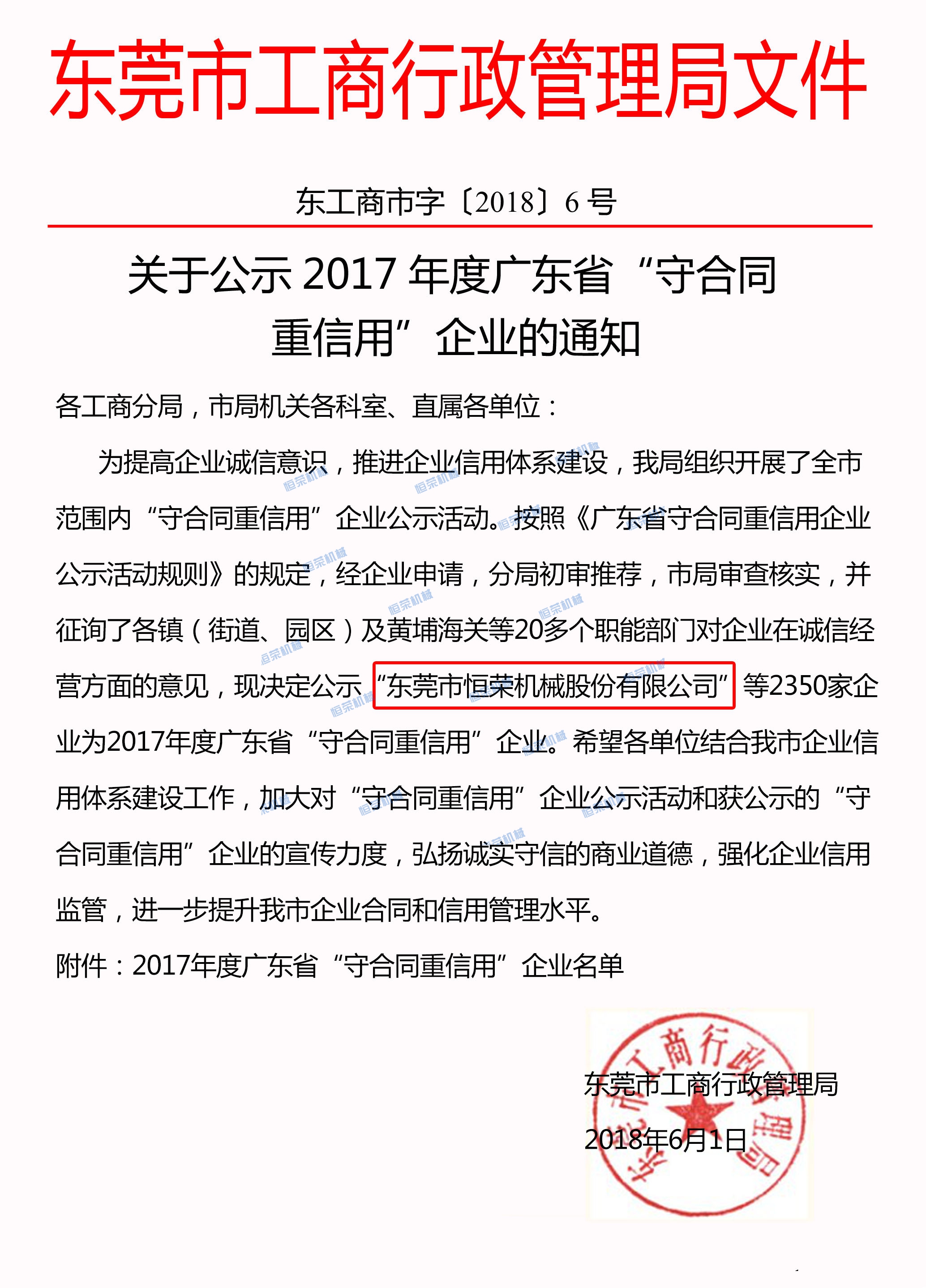 日前,广东省工商行政管理局在网上公示了“守合同重信用企业”申报程序及考评标准,经相关机构重重筛选、严格评定,我公司被评为“2017年度市级守合同重信用企业”。